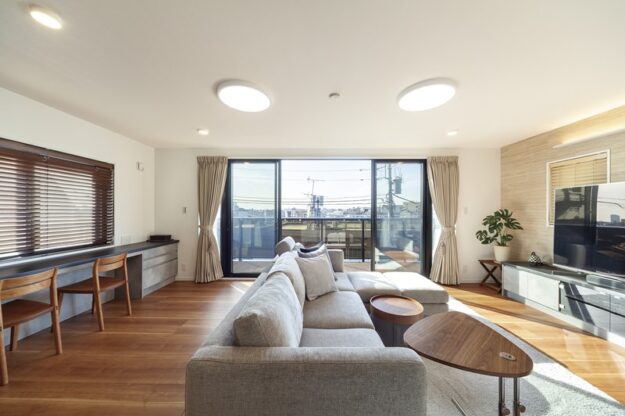 case study 47 大田区 T様邸 富士山眺望を愉しむ屋上付き3階建て専用RC住宅 代々続くお屋敷からの建て替え 大開口の3階リビング・屋上からは富士山を眺望 LDKのある3階には広いテラスを設け、夜は間接照…