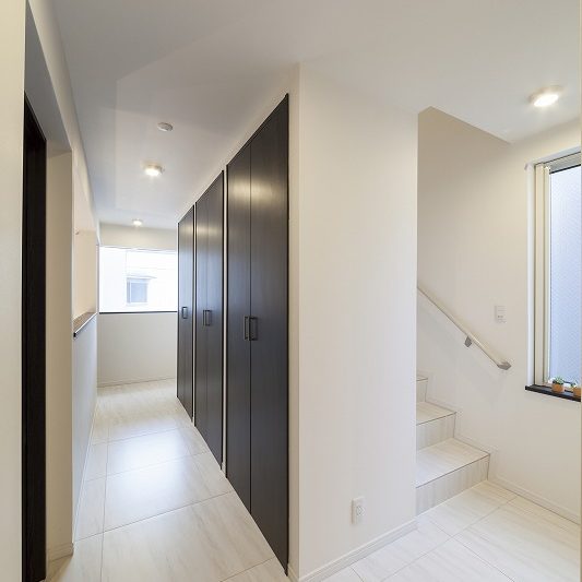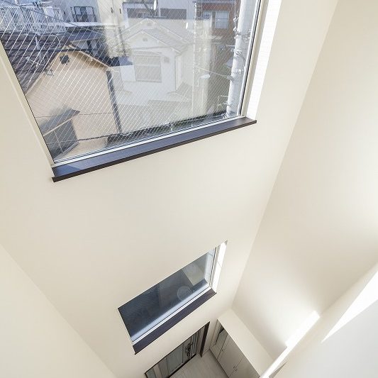 • 玄関には3階まで伸びる開放感のある吹き抜け。1階LDKにも吹抜けを設け、空間の一体感を演出。