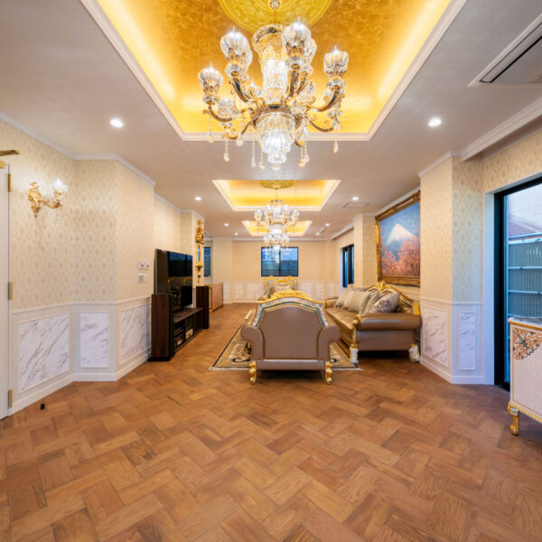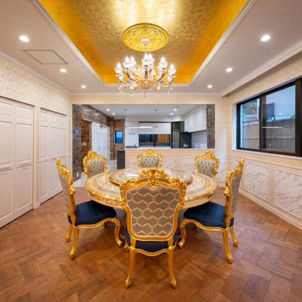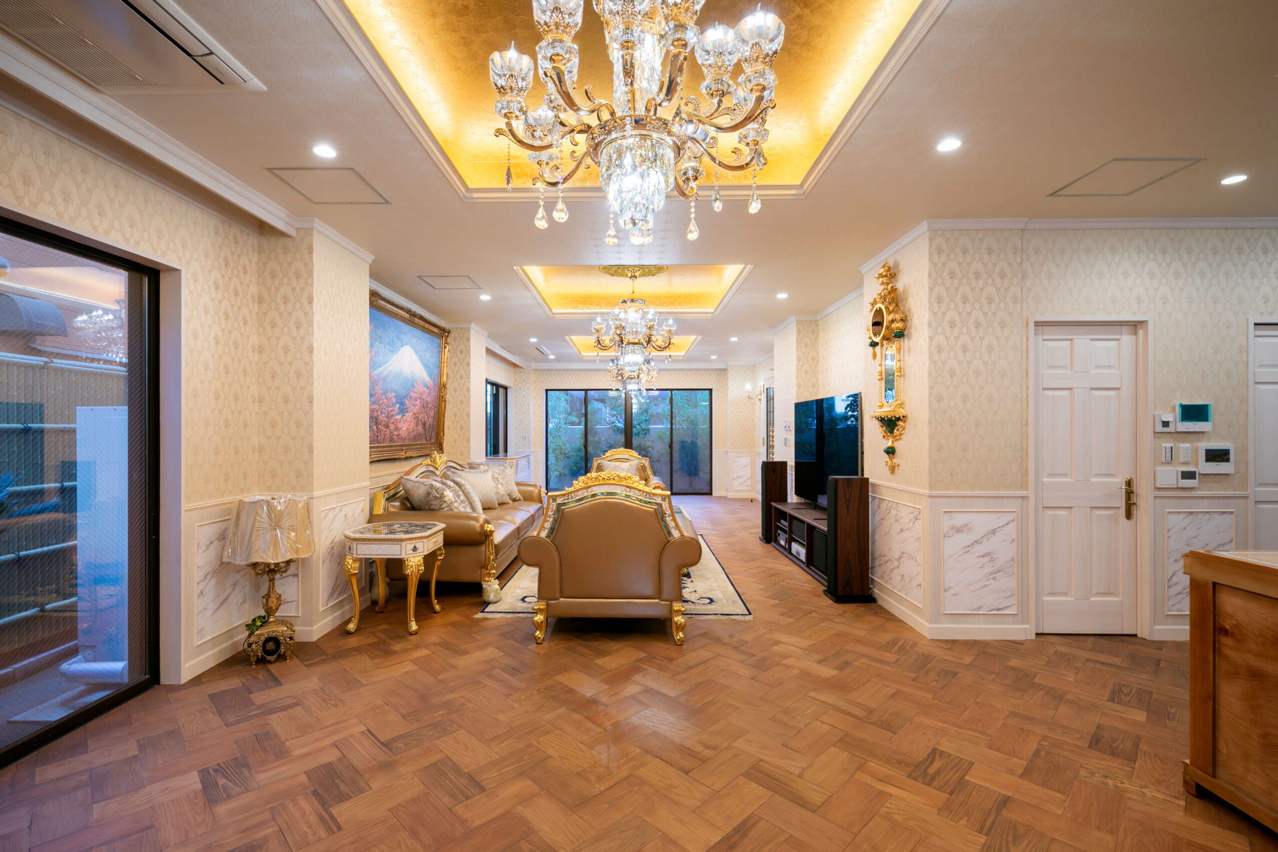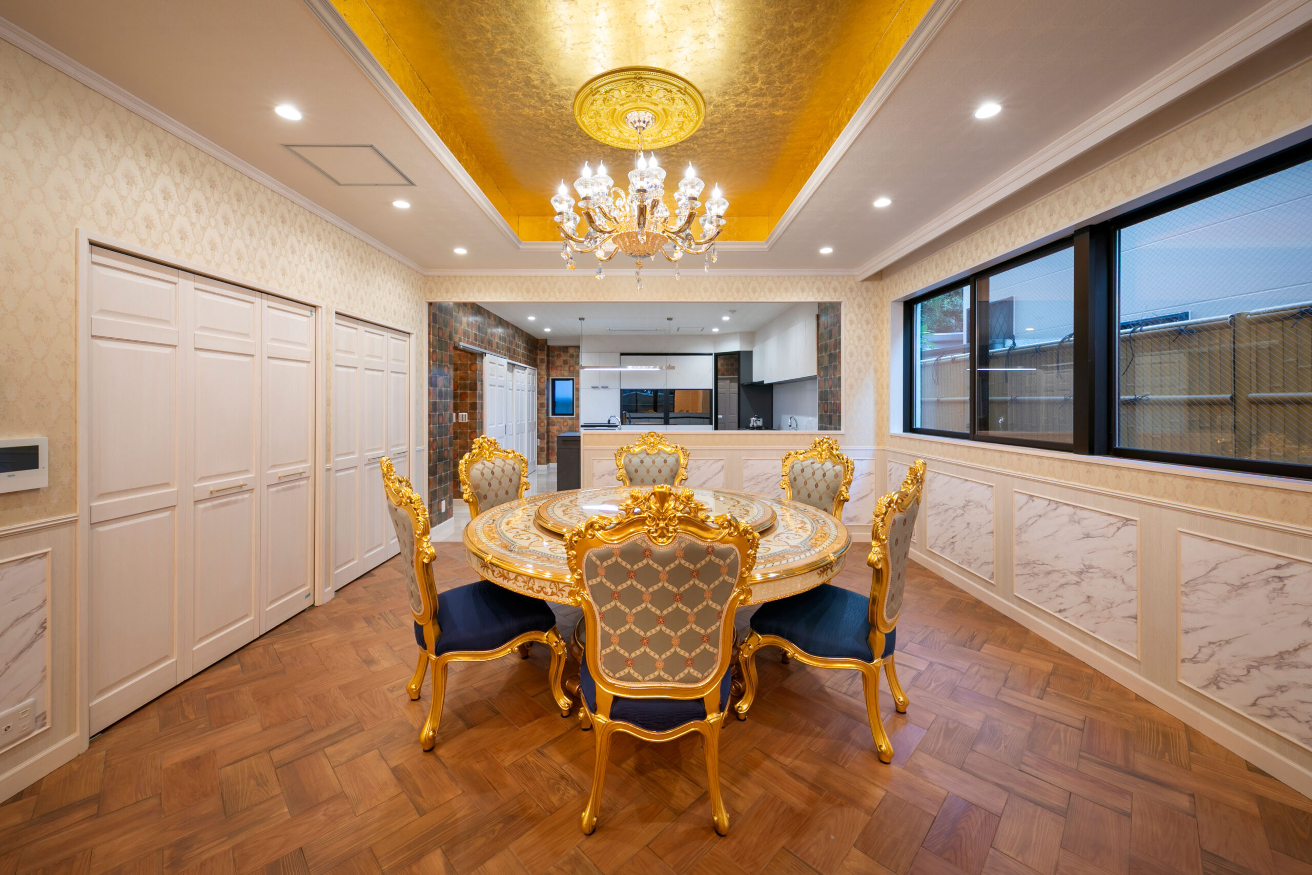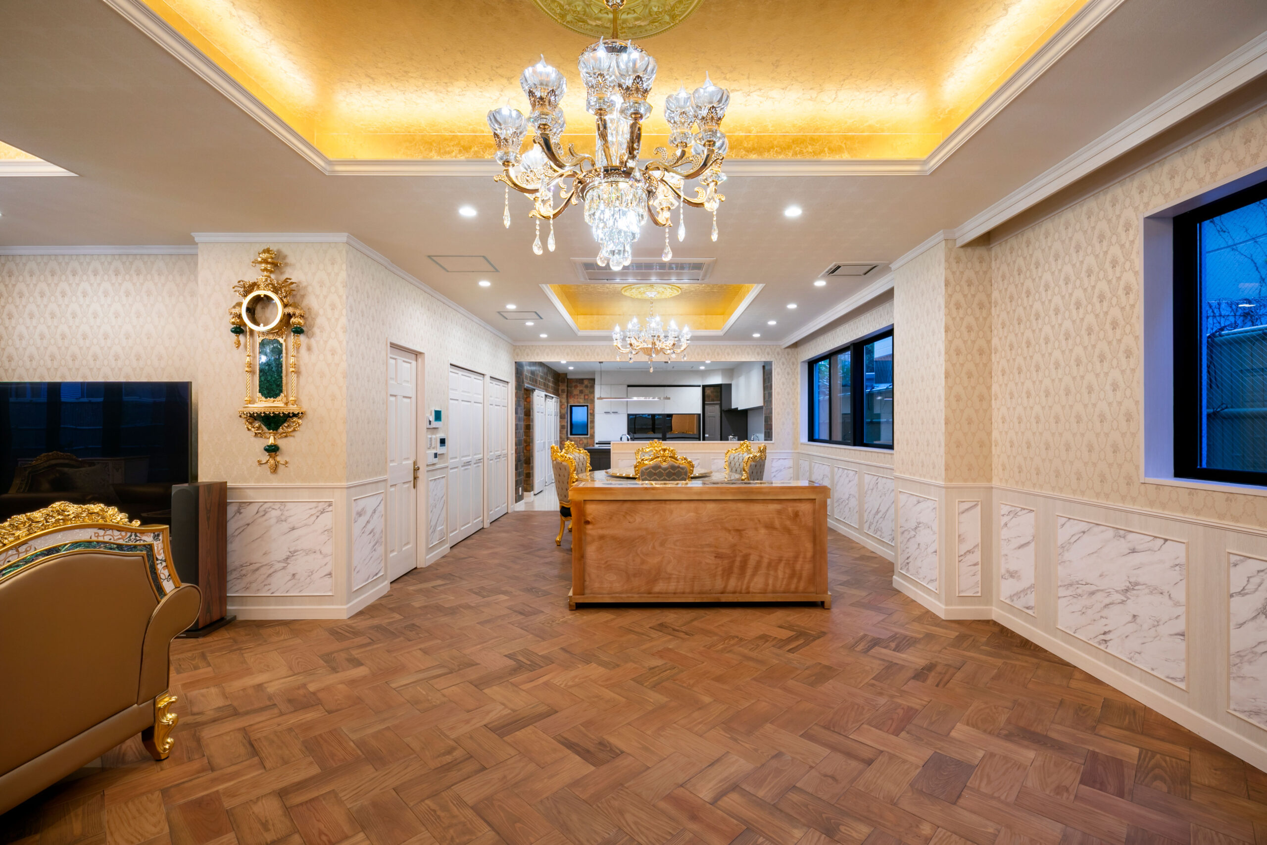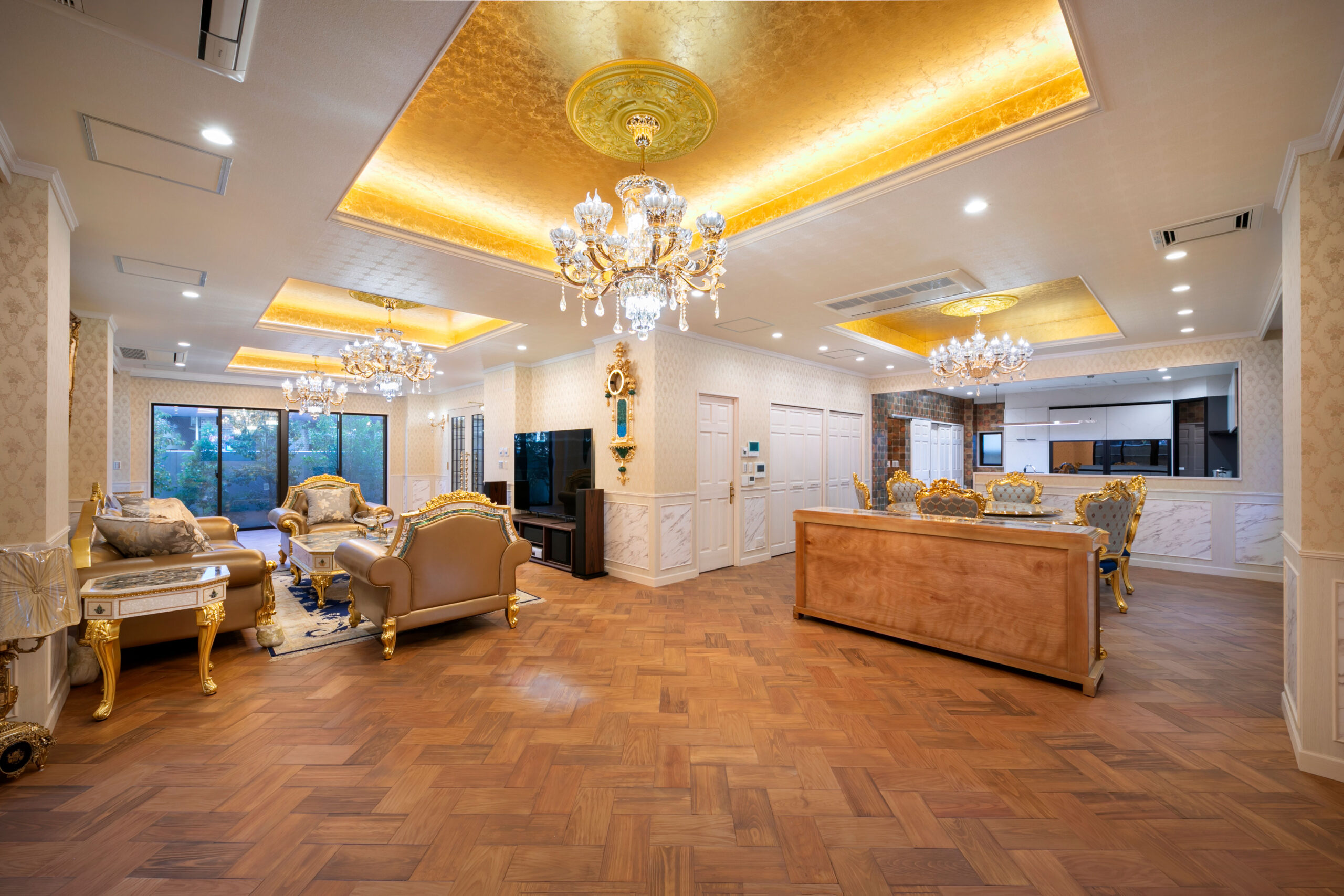 ・1階LDKはパーティができるよう53畳の広さを確保。折り上げ天井の内部は本物の金箔を使った特注の壁紙で仕上げています