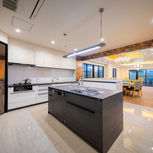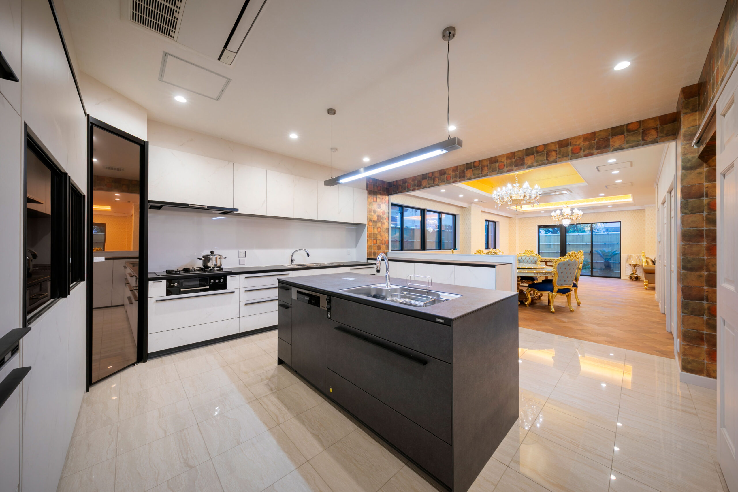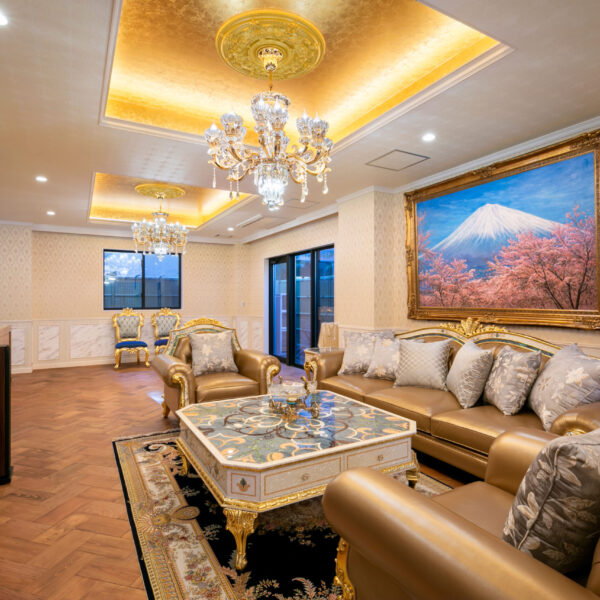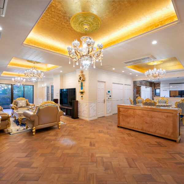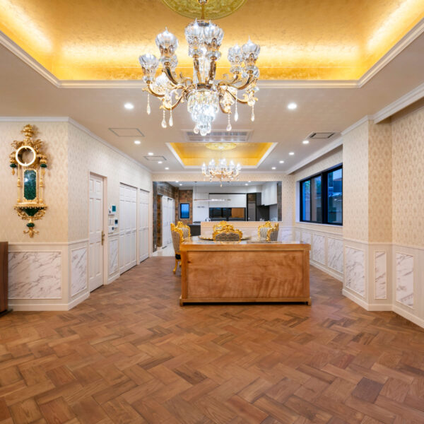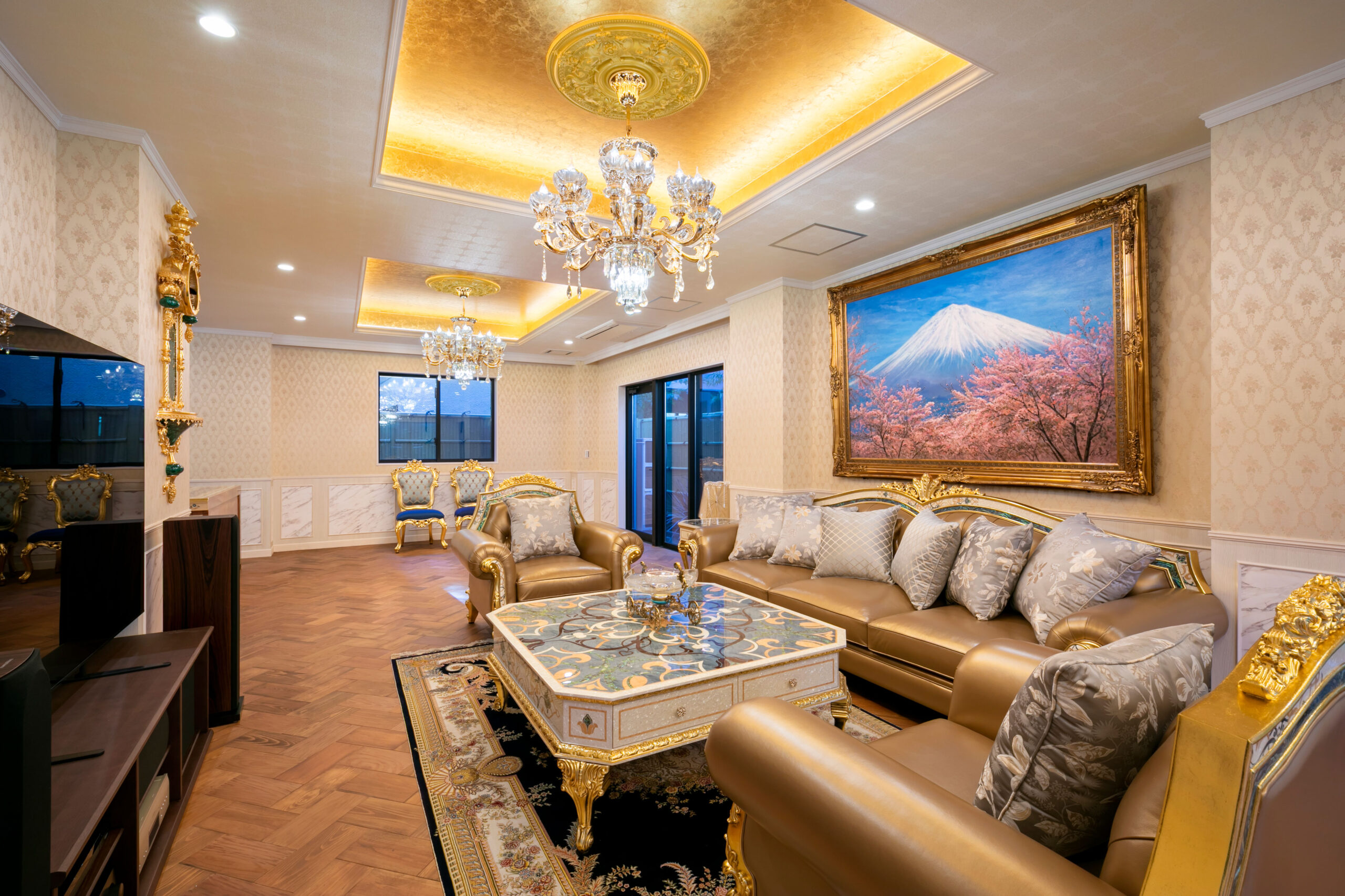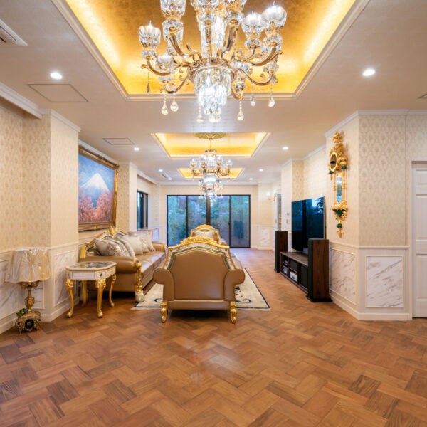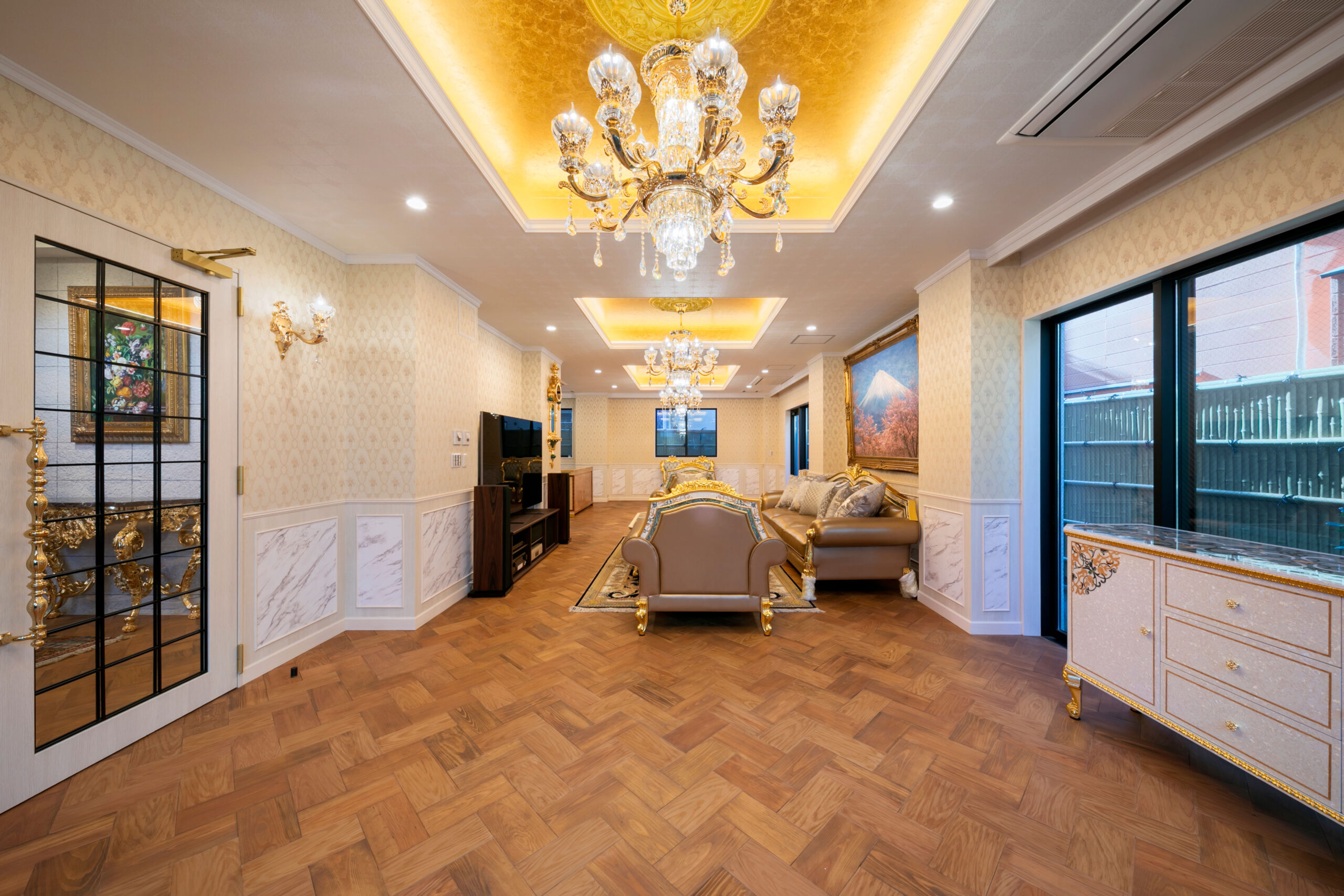 ・1階LDKはパーティができるよう53畳の広さを確保。折り上げ天井の内部は本物の金箔を使った特注の壁紙で仕上げています