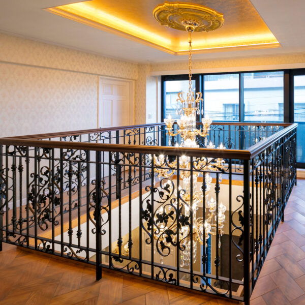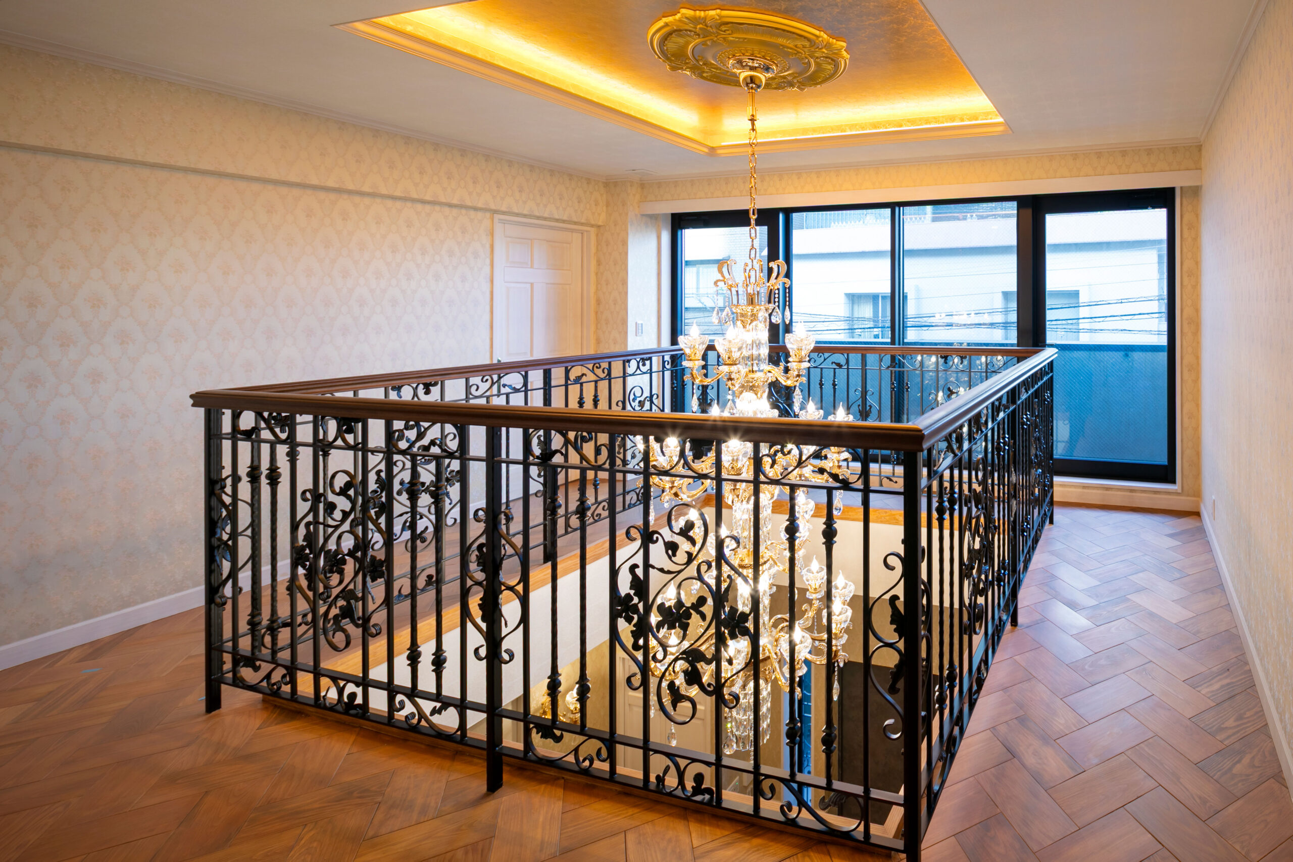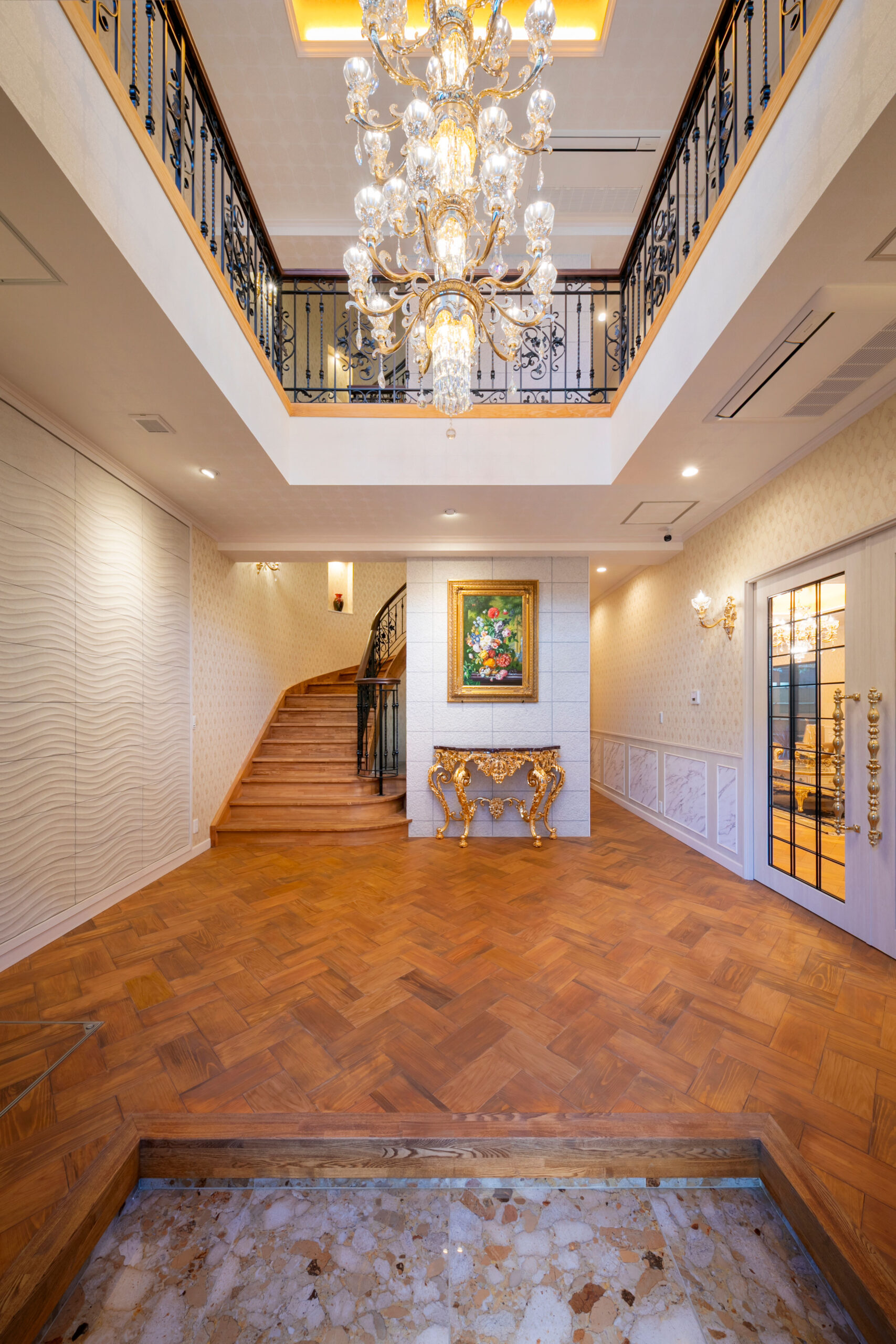 ・豪華なシャンデリアが迎えてくれる壮麗な玄関ホール。螺旋階段は「舞台へおりてくるような」イメージでというご希望で設計