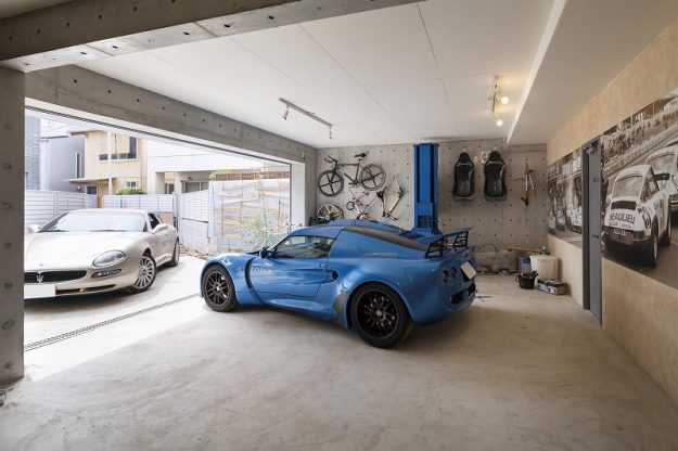case study 30 渋谷区 O様邸 都心で実現するこだわりのライフスタイル。人生を楽しむための専用住宅。 旦那さんのこだわりガレージには油圧のリフトも設置、日常の整備からレストアまで対応可能。 内装は西洋漆喰…